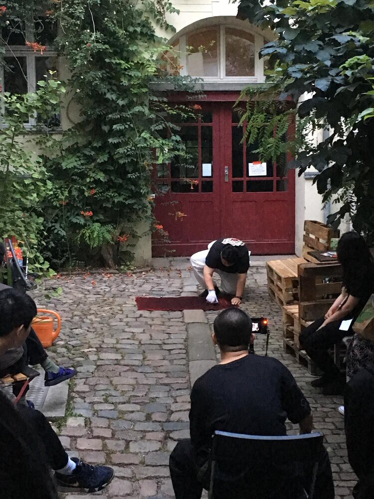 Before the performance, the surface of a ready-made red carpet purchased in the market was painted black by the artist. After showing the painted carpet, the artist laid the carpet and tried to draw the word “PEACE” on the carpet with a sharp object. Upon completion, the artist re-displayed the carpet to the audience. Afterwards, the artist laid the carpet back to the ground and took out the vacuum cleaner to clean the carpet. After the cleaning was completed, the artist showed the carpet again. The word “PEACE” on the carpet and the black color disappeared and the original red color appeared again.